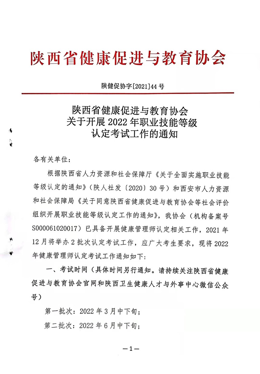 陕西省健康促进与教育协会关于开展2022年职业技能等级认定考试工作的通知